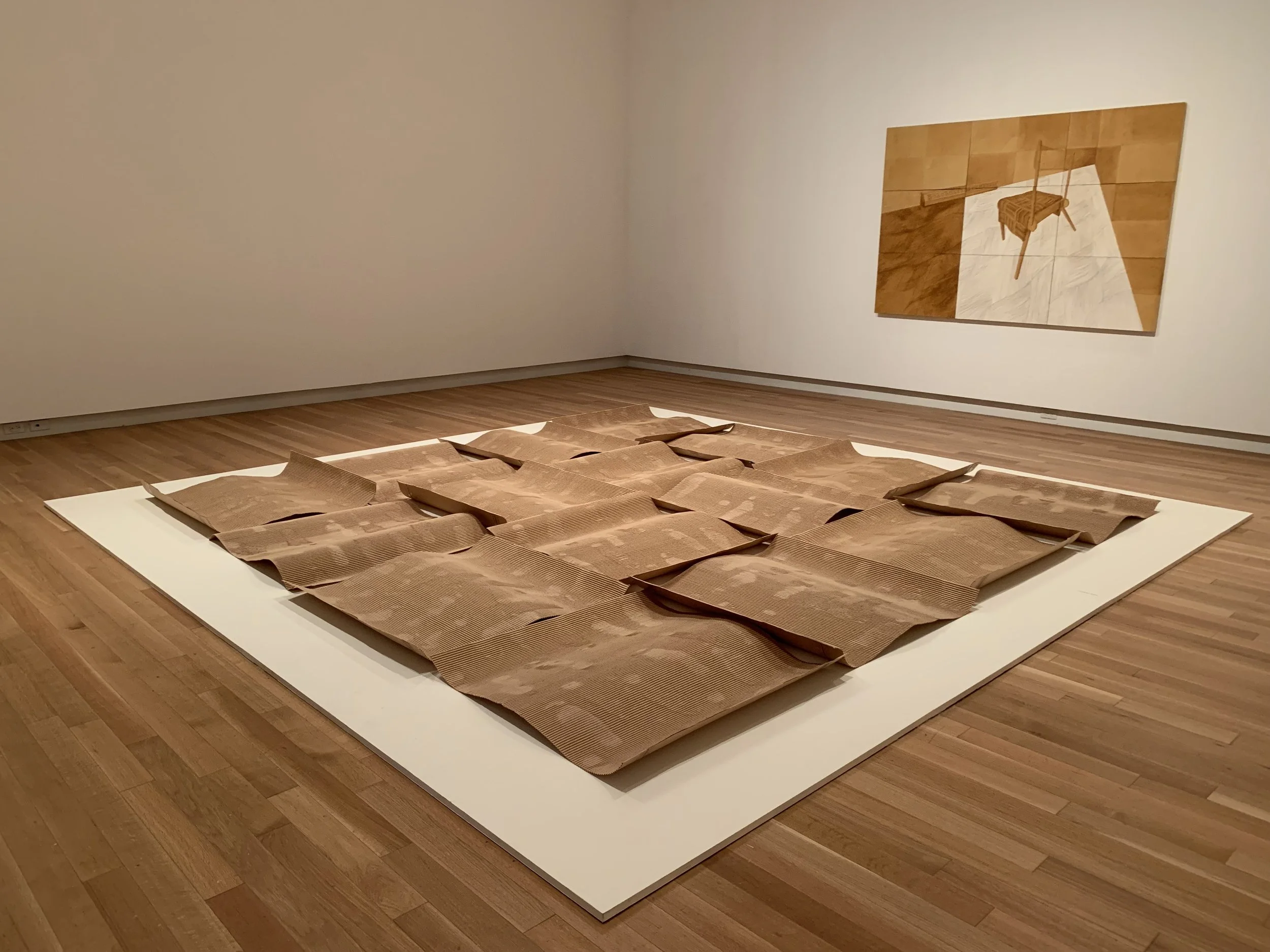 Opening the doors to the exhibition, Heer Mandaliya’s The Boundaries Are Now Crossed (2023) greets the visitor first. Wavy segments of corrugated cardboard ripple along the floor of the gallery. The interchanging direction of the ripples cast light and shadows and, as I walked around the work, this created the illusion of choppy waves transitioning with my own movement. To me, the imprints of footsteps on the cardboard seem to indicate that the boxes were once flat and stationary but now they are in transition.