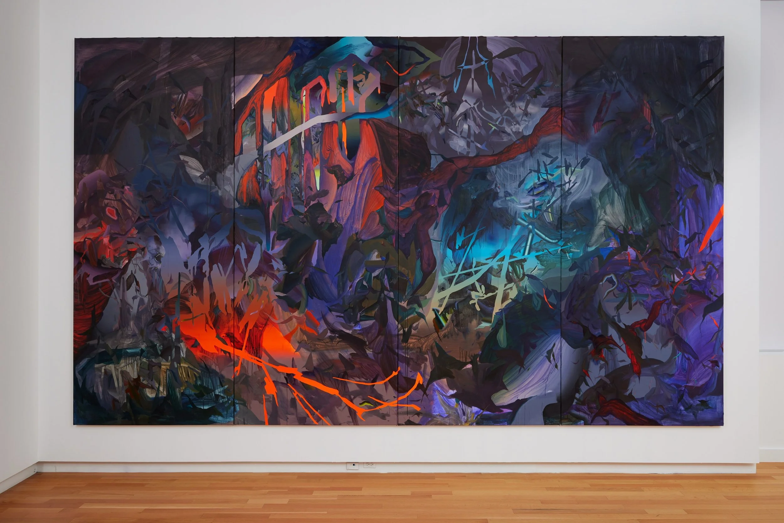 In terms of the way that it's shining [referencing the glow of the painting caused by the bright room it's displayed in] I actually really liked having the big window space [in the gallery] because it felt like a bit of a gift to the painting. You’ve been in this dark studio space the whole time you’re being made and then immediately being rolled up and then going to my new studio with no window. This is your first time seeing real daylight! Enjoy it!